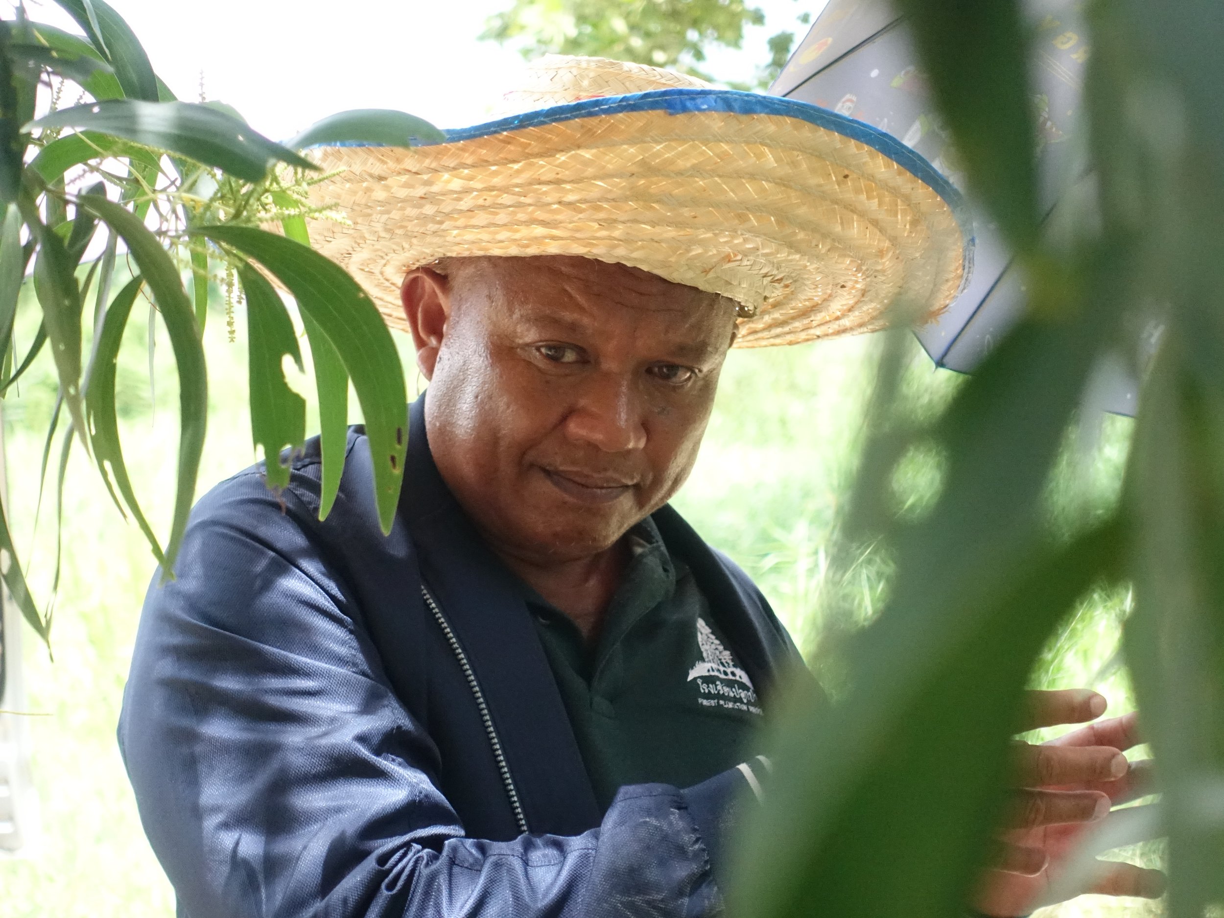 The rest of the day, we accompanied Ajarn Nopporn to the properties of San Fun Group — Five Palms Forest Park, named after the five palm trees at the entrance of the premise, was the first destination. This 32-acre land has been allocated for commercial forest, small cattle husbandry, and future San Fun projects. Today's mission was to evaluate the condition of over 3,000 teaks and padauks planted years ago. Ajarn Nopporn glanced at the trees, now standing over two meters tall.
